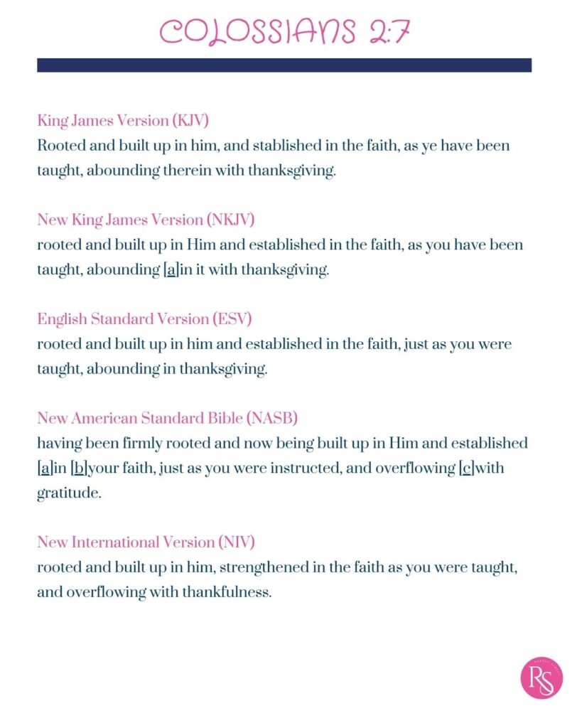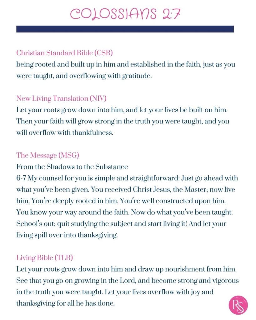 Choose a translation that feels natural and comfortable for you. Click the download to see Colossians 2:7 in all the various formats.